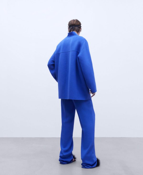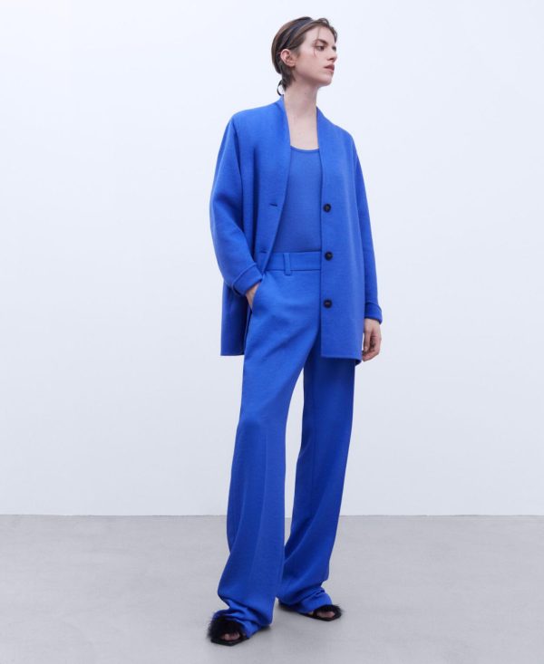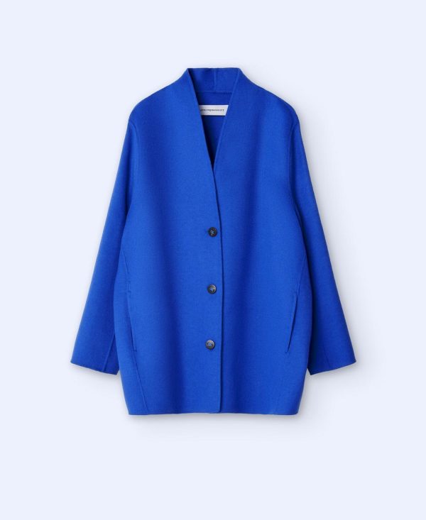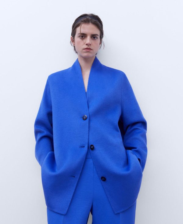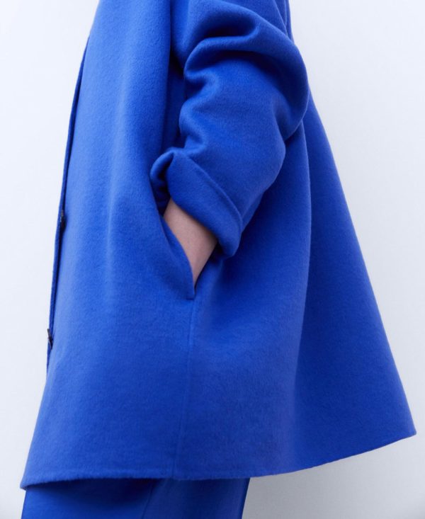 Abrigo corto en tejido de lana merino. Doble faz. Silueta redondeada. Cierre cruce con tres botones. Bolsillos oblicuos en vivo.