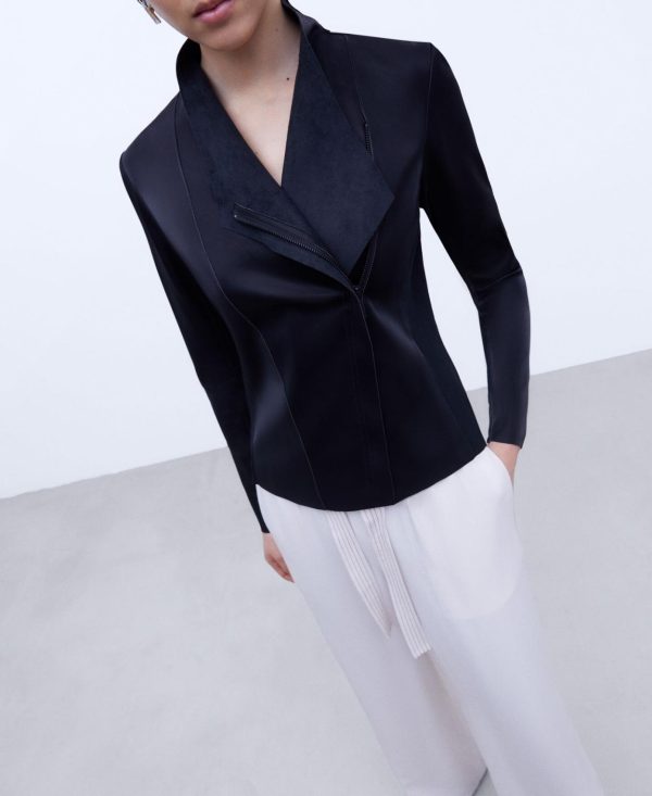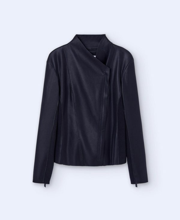 Chaqueta biker en poliéster textura piel. Manga larga. Solapa cruzada. Cierre cremallera. Entallada. Capa impermeable poliuretano.