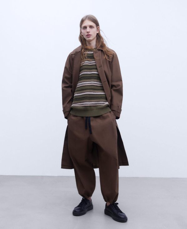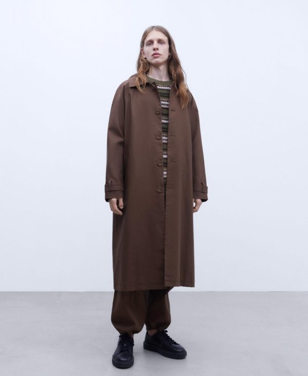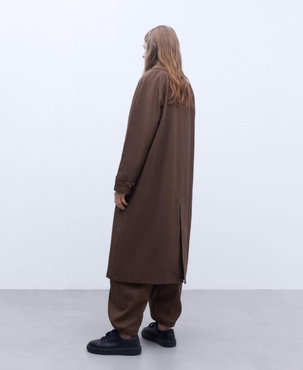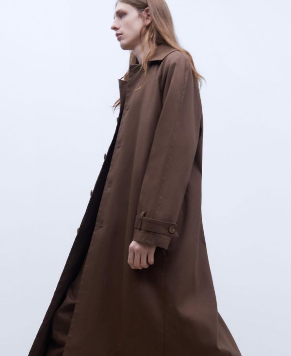 Gabardina oversize en algodón encerado. Cuello solapa. Botonadura vista. Trabillas moldeadas en los puños.