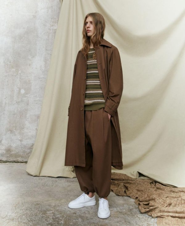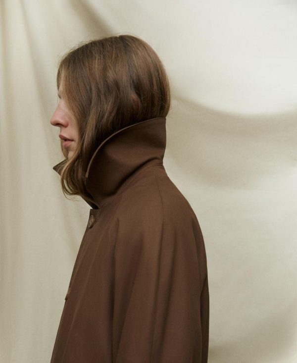 Gabardina oversize en algodón encerado. Cuello solapa. Botonadura vista. Trabillas moldeadas en los puños.