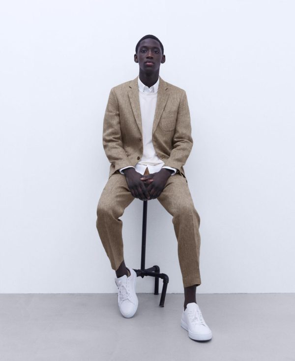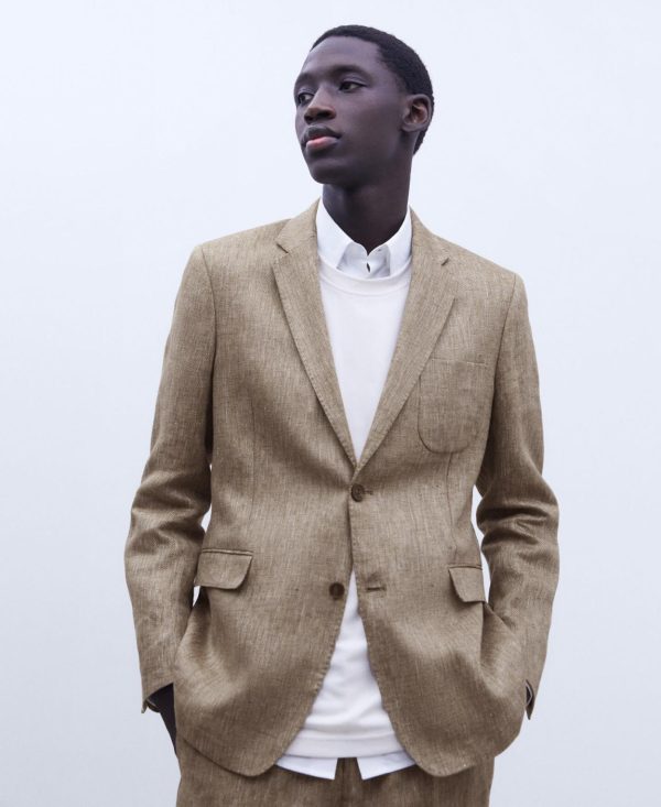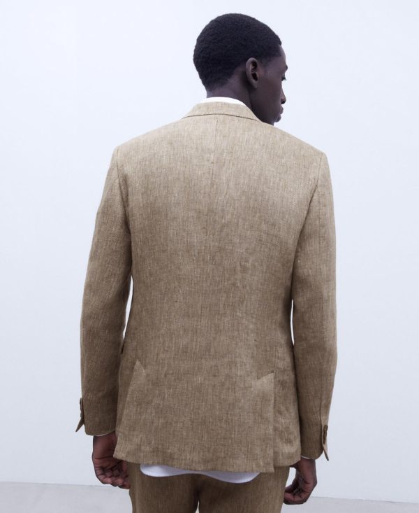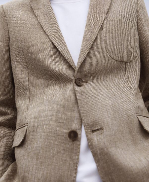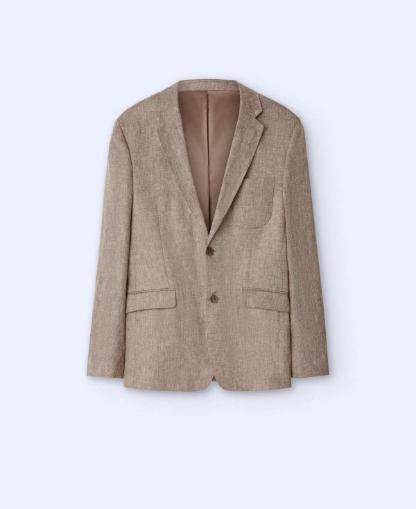 Cuello solapa. Dos botones. Dos aberturas traseras. Bolsillos en vivo con tapeta. Bolsillo parche en el pecho. Tres botones en bocamanga.