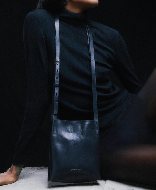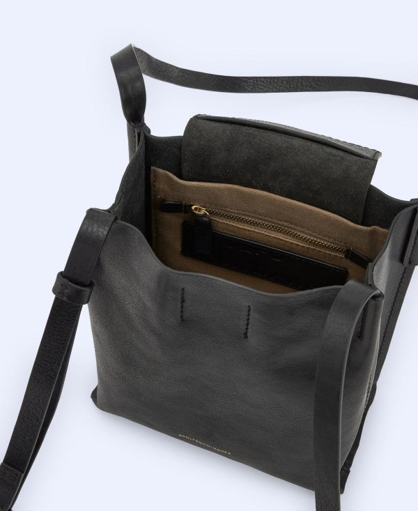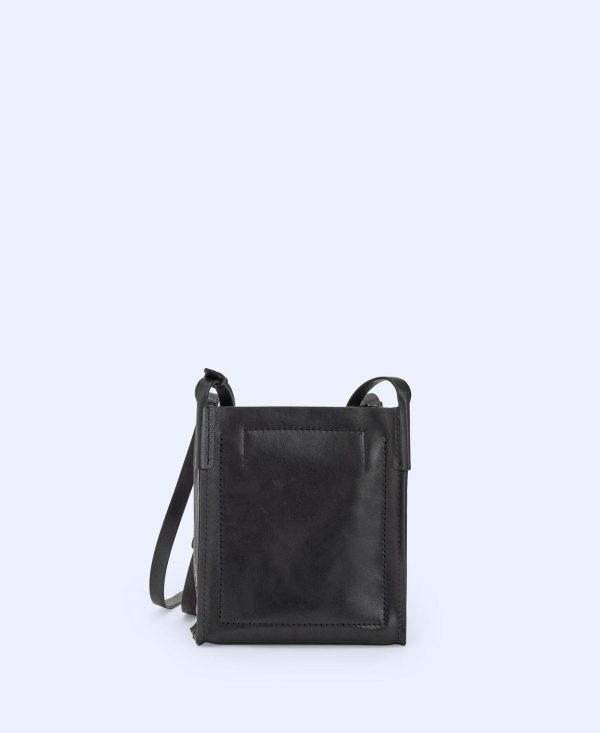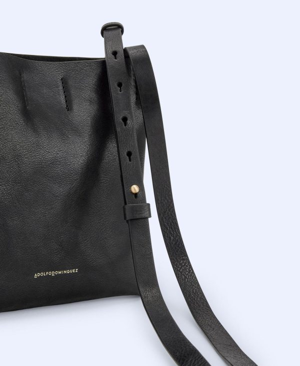 Bandolera cubo en piel vaqueta. Piel bovina. Forro de algodón orgánico 100%. Dos compartimentos. Bolsillo interior con cremallera. Asa larga regulable. Logotipada.