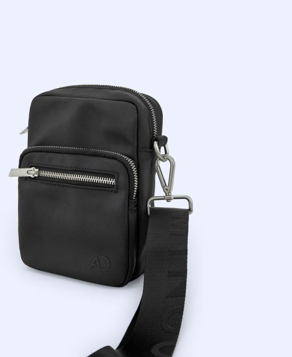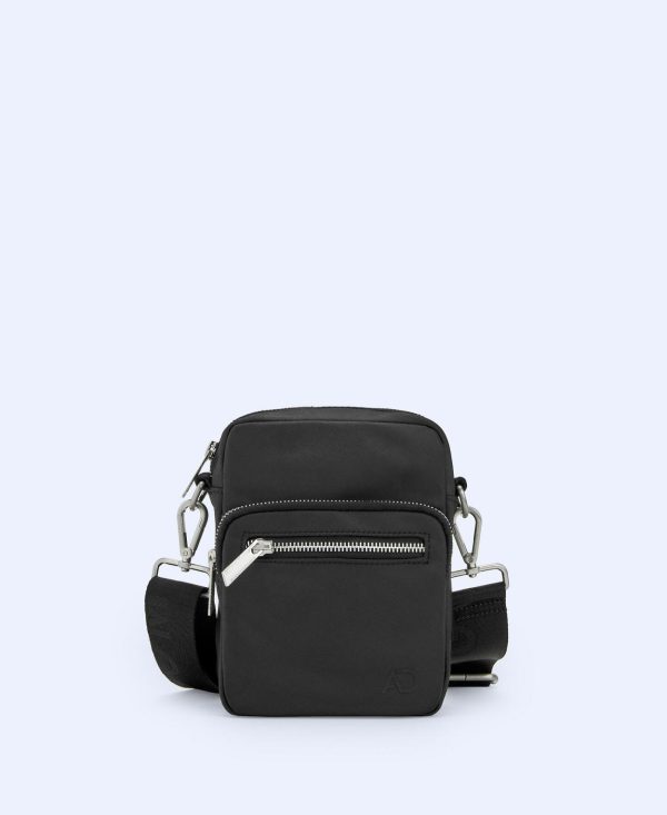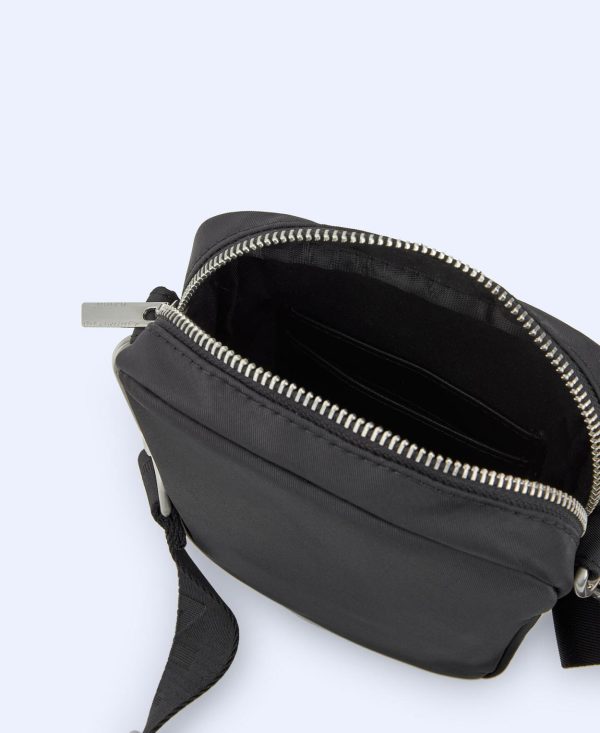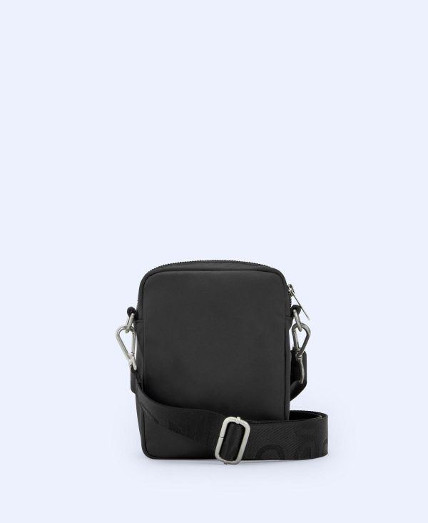 Un compartimento. Cierre cremallera metálica. Bolsillo frontal. Tiras logotipadas en nailon. Mosquetones metálicos.