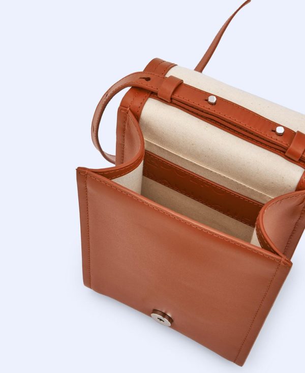 Minibolso en piel bovina lisa. Cierre con solapa y broche de presión. Asa larga regulable. Logotipado. Forro en algodón.
