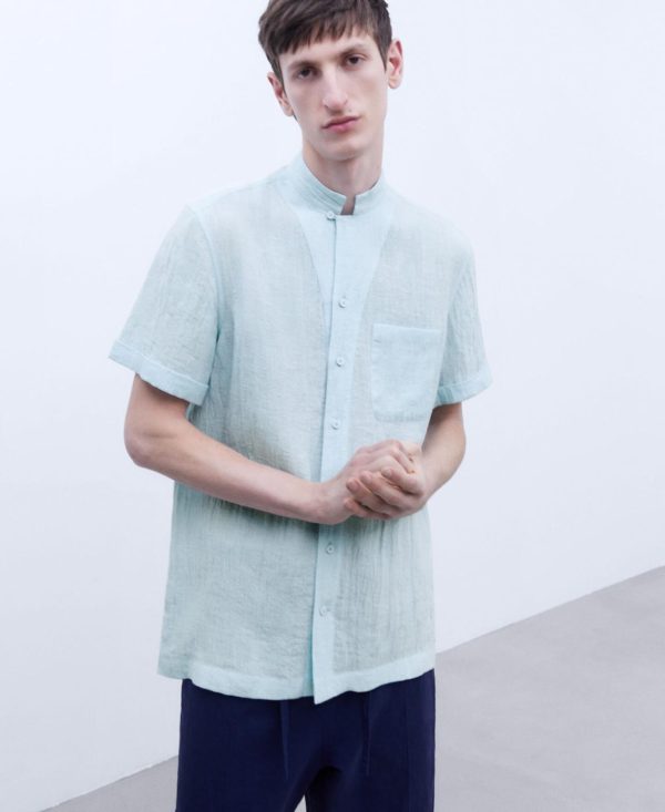 Adolfo Domínguez Camisas | Camisa Cuello Mao En Lino Europeo Azul Celeste Hombre