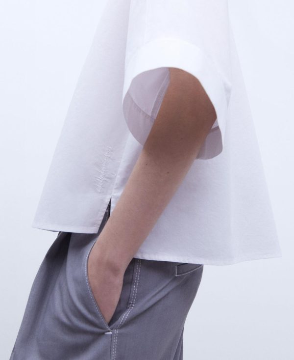 Manga al codo con dobladillo. Botonadura central con tapeta. Logotipo vintage bordado. Aberturas laterales. Bajo asimétrico.