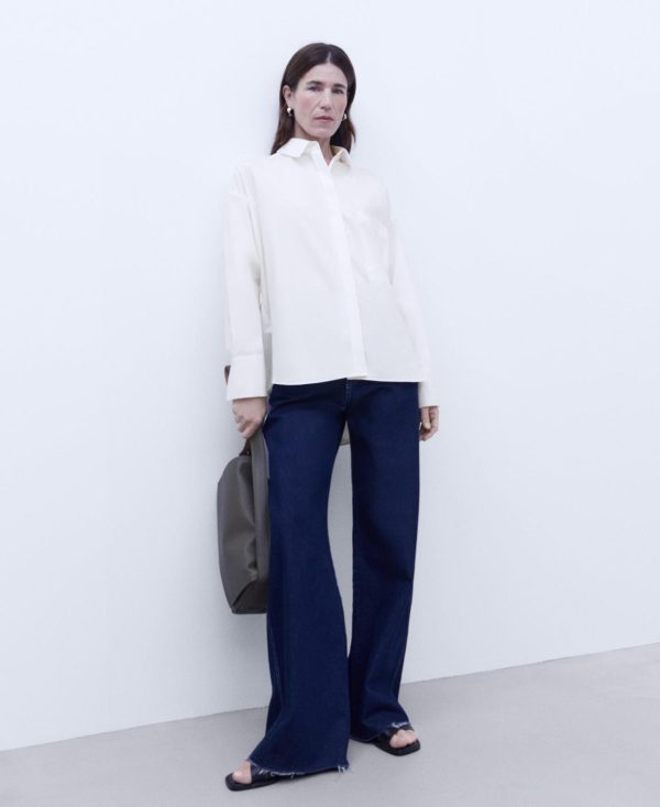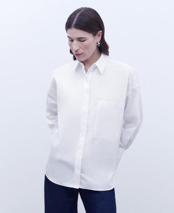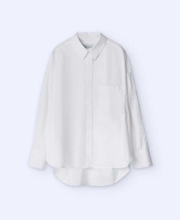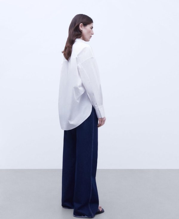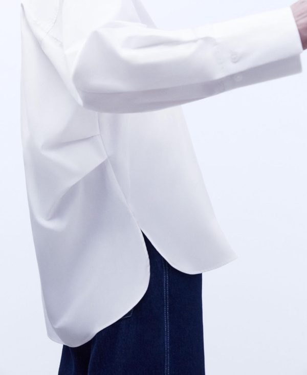 Camisa holgada en algodón. Cuello camisero. Volumen redondeado. Pinza lateral. Manga larga. Puño camisero.