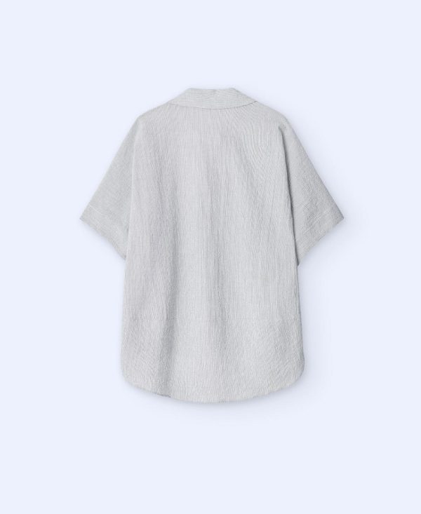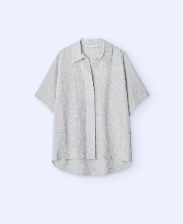 Estructura cuadrada. Cuello polo. Botonadura oculta. Manga corta amplia. Bajo irregular.