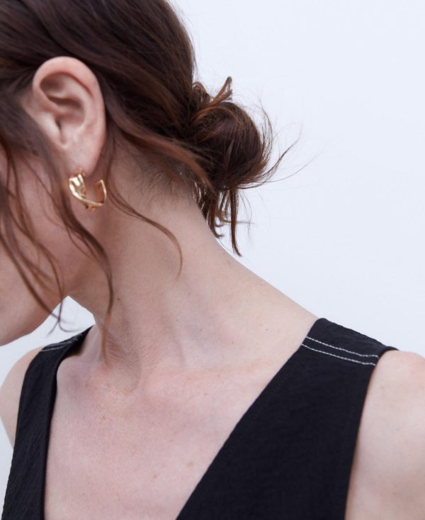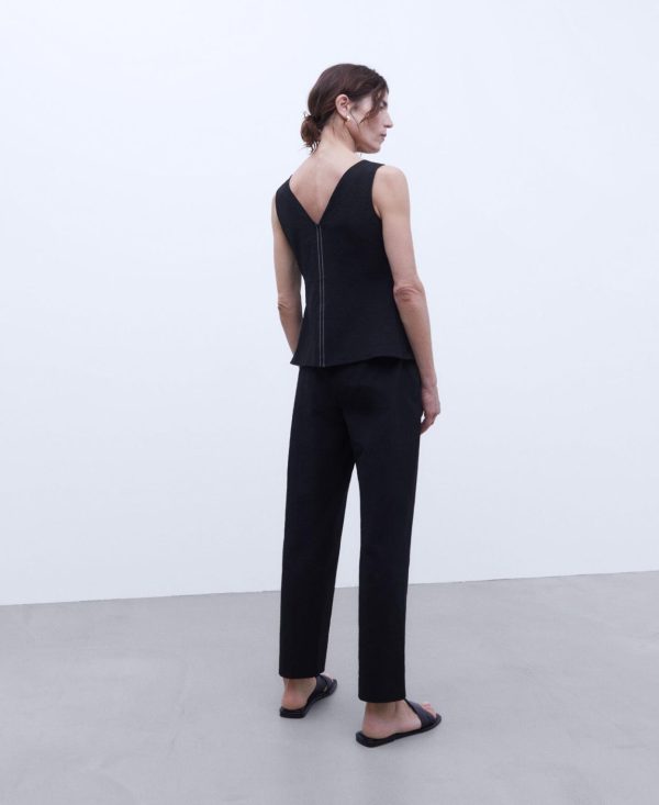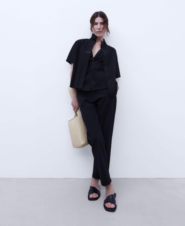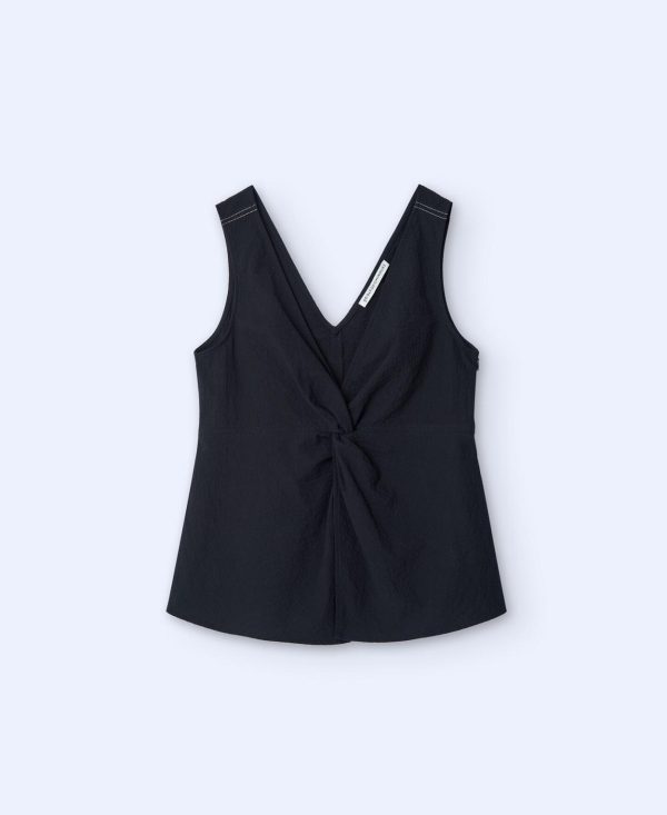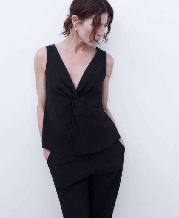 Doble escote pico. Recogido con nudo. Largo sobre cadera.