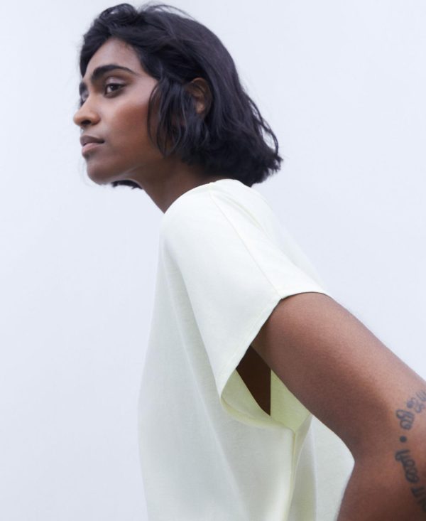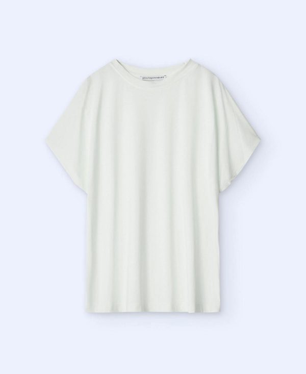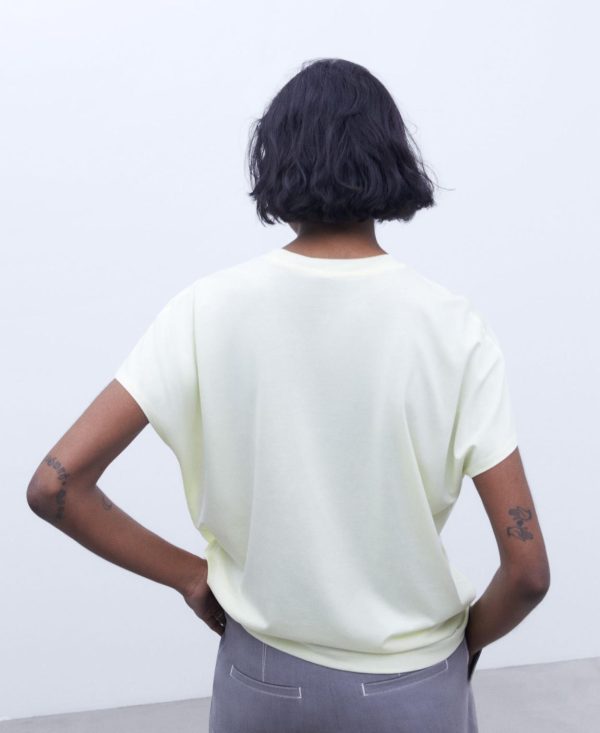 Camiseta en lyocell y algodón. Cuello caja. Manga corta y redondeada. Bajo recto.