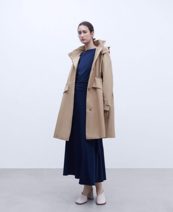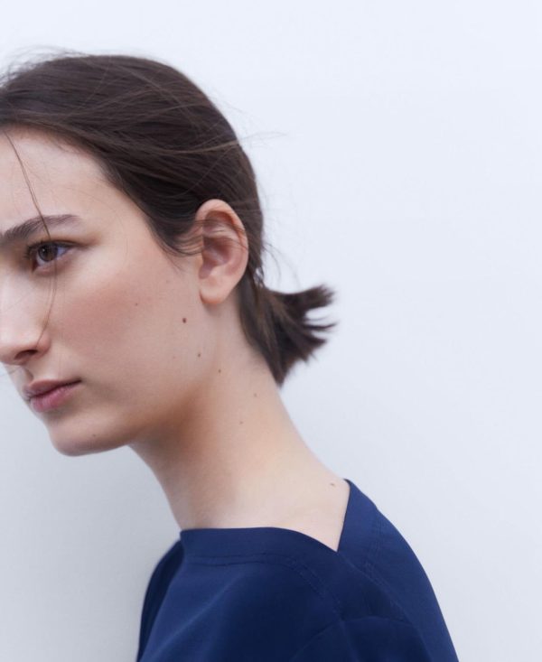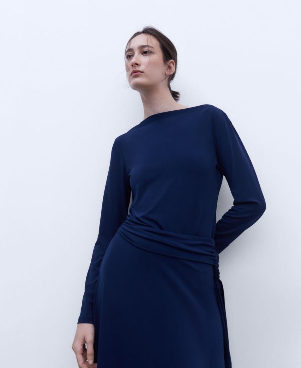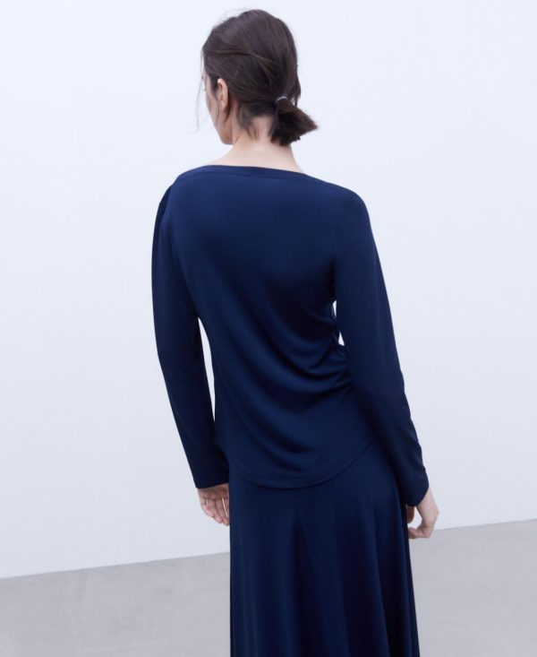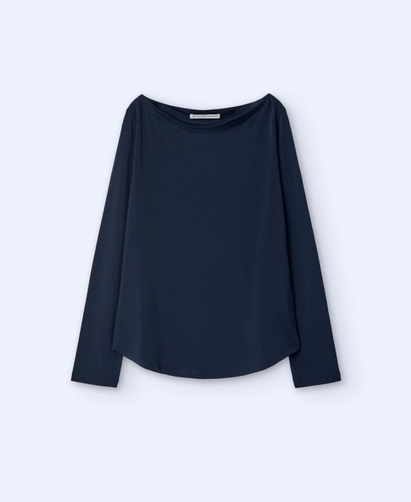 Camiseta con escote barco. Manga larga y sentada. Semientallada. Bajo redondeado. Logotipada.