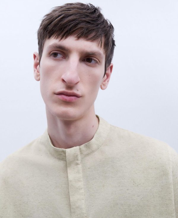 Manga corta. Cuello Mao. Cierre botones con tapeta.