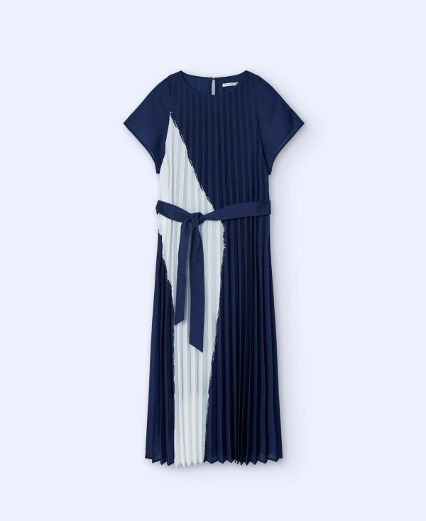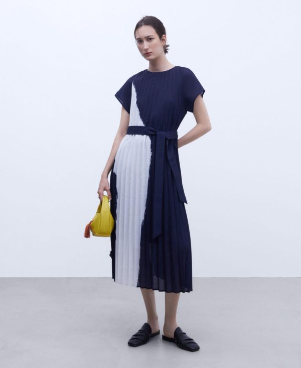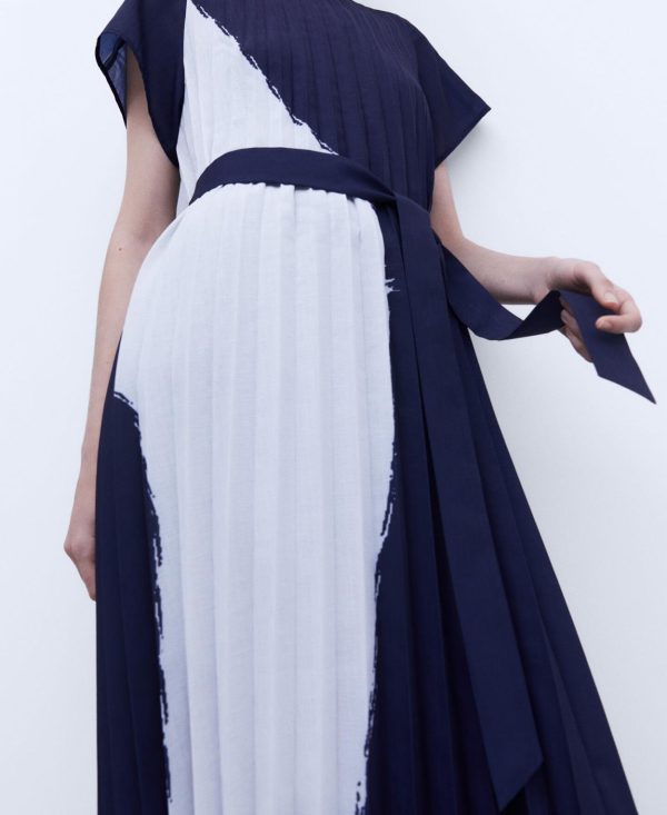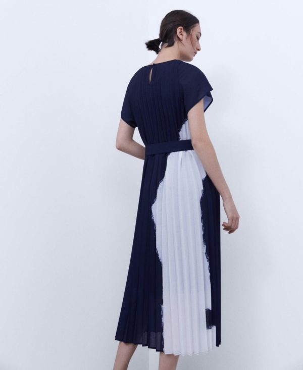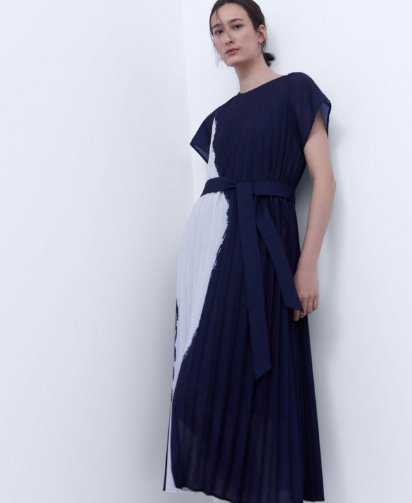 Vestido en crinkle estampado. Cuello redondo. Cierre de botón posterior. Manga corta y amplia. Cinturón. Bajo con remates a contraste.