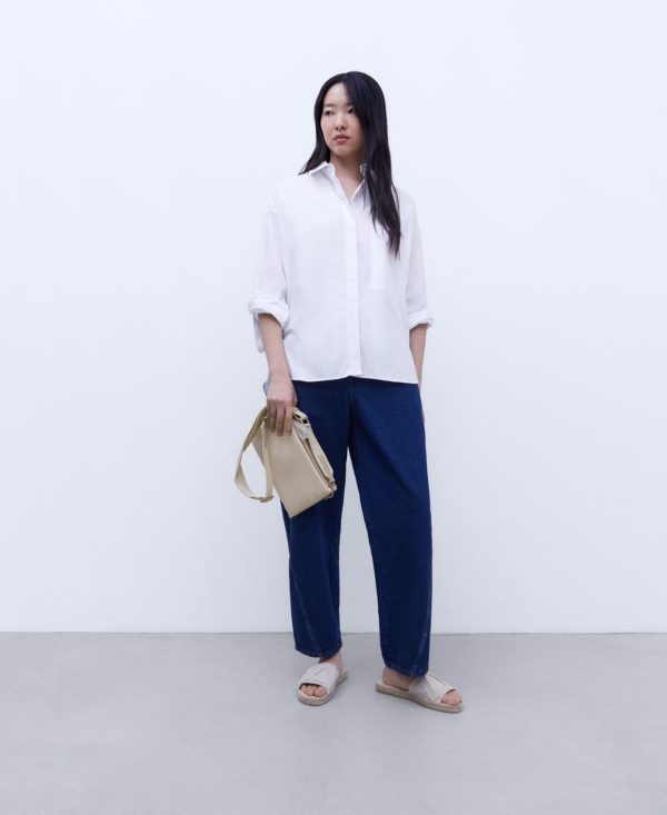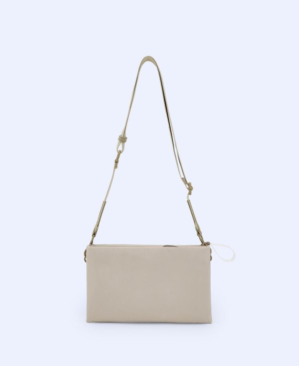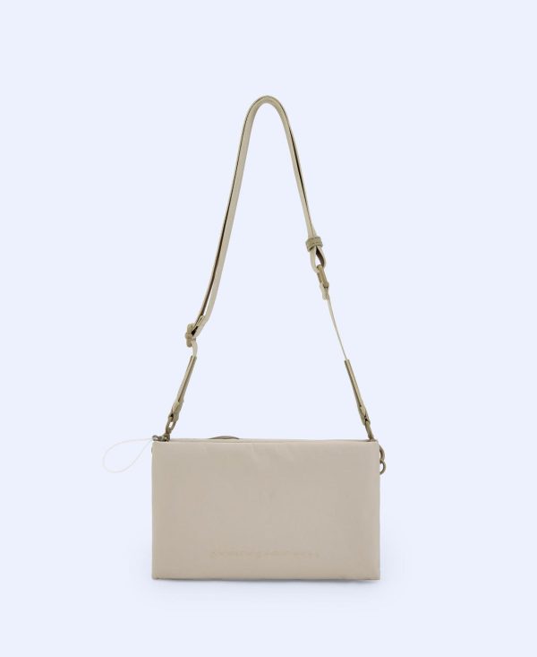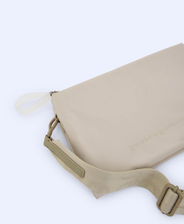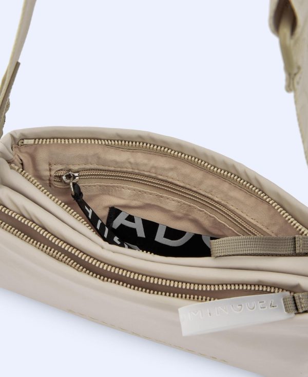 Textura lisa. Dos compartimentos. Cierre de cremallera. Asa larga en nailon reciclado. Cinta logotipada.