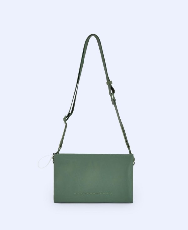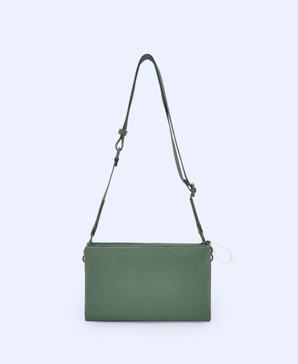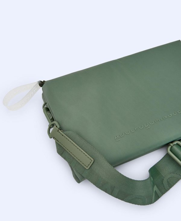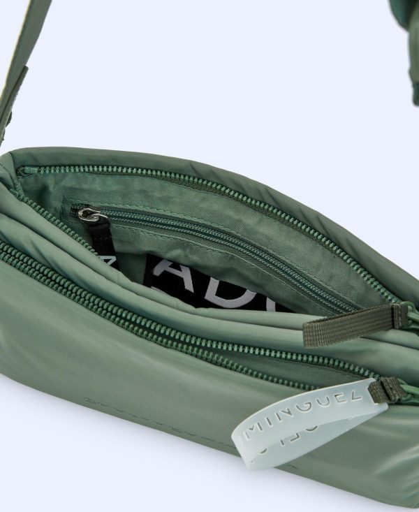 Textura lisa. Dos compartimentos. Cierre de cremallera. Asa larga en nailon reciclado. Cinta logotipada.