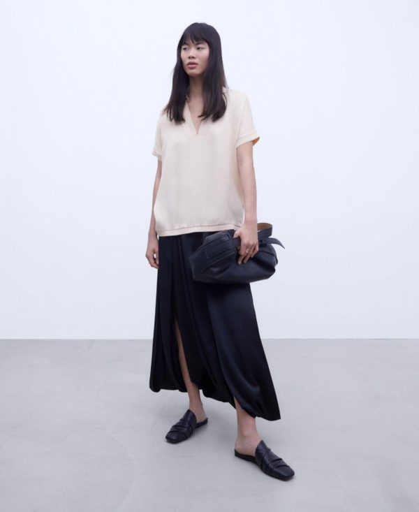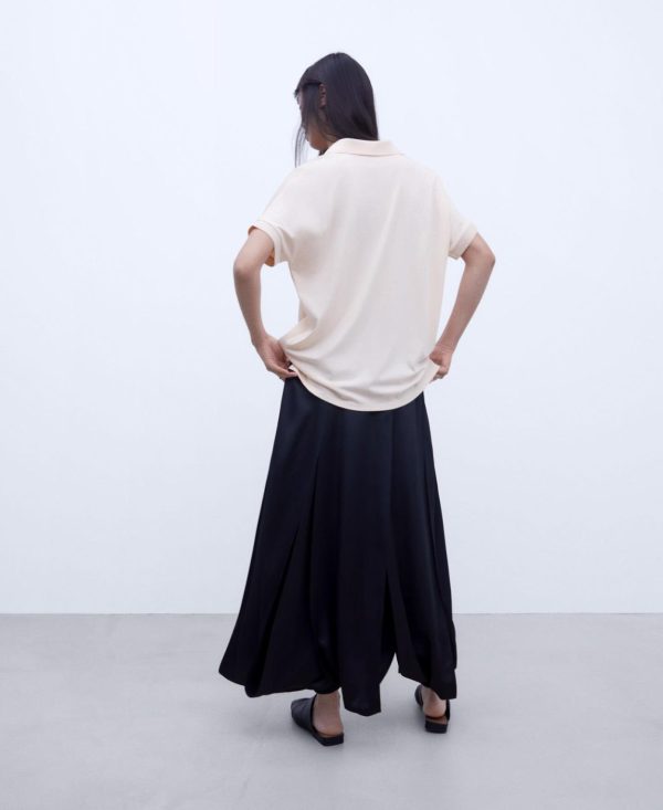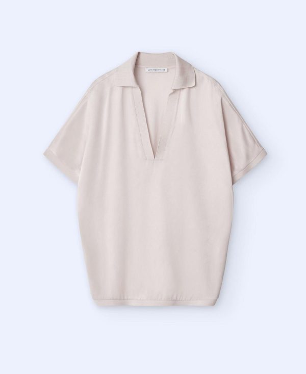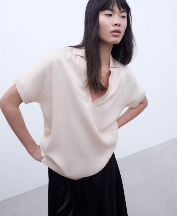 Camiseta en viscosa. Cuello pico con solapa. Manga japonesa tres cuartos. Fluida. Aberturas laterales. Remates en canalé.