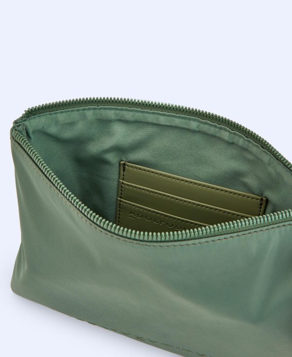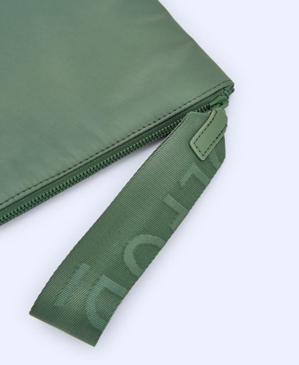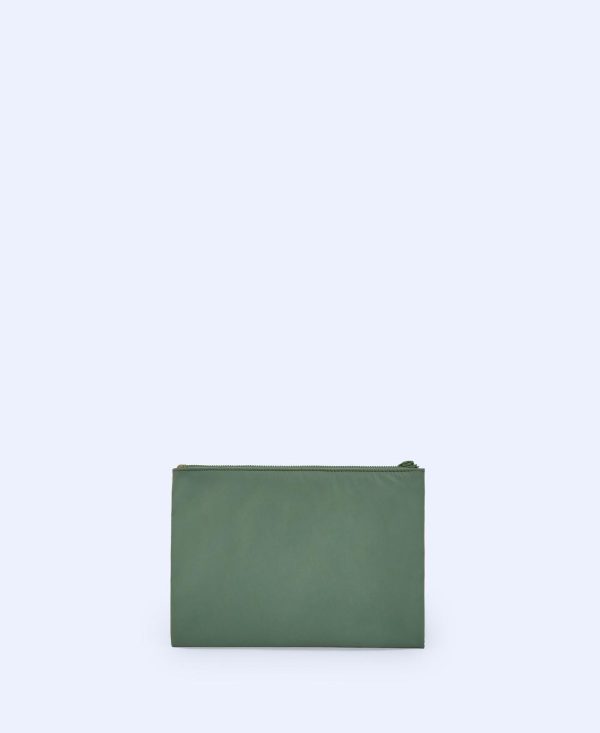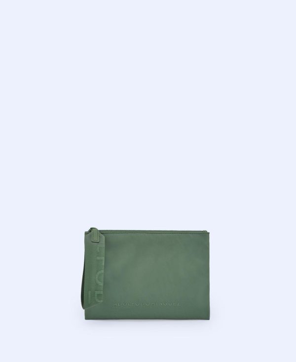 Clutch rectangular en textura lisa. Un compartimento. Cierre con cremallera. Tarjetero interior. Logotipado.