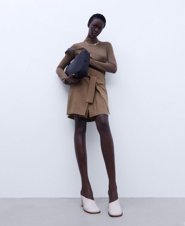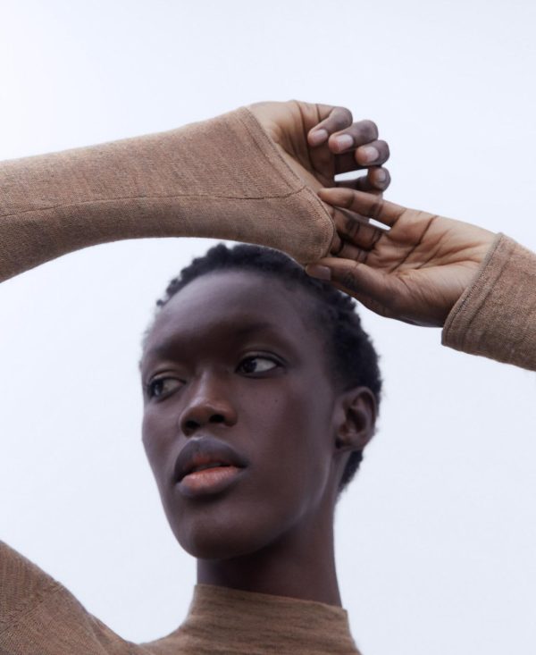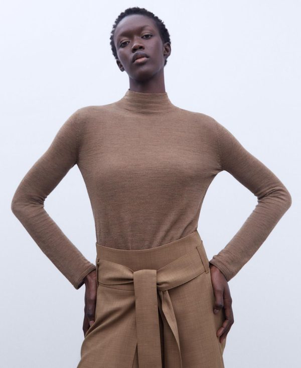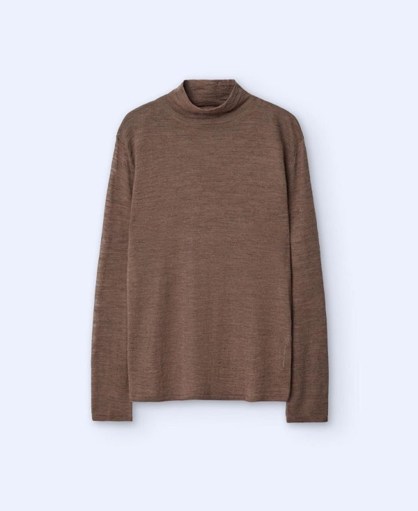 Jersey en tejido de lino y alpaca. Cuello chimenea. Manga larga. Remates en canalé.