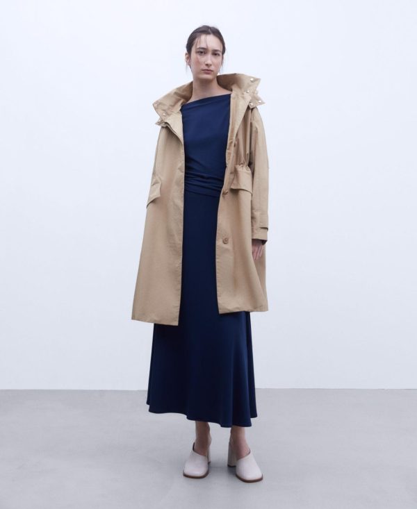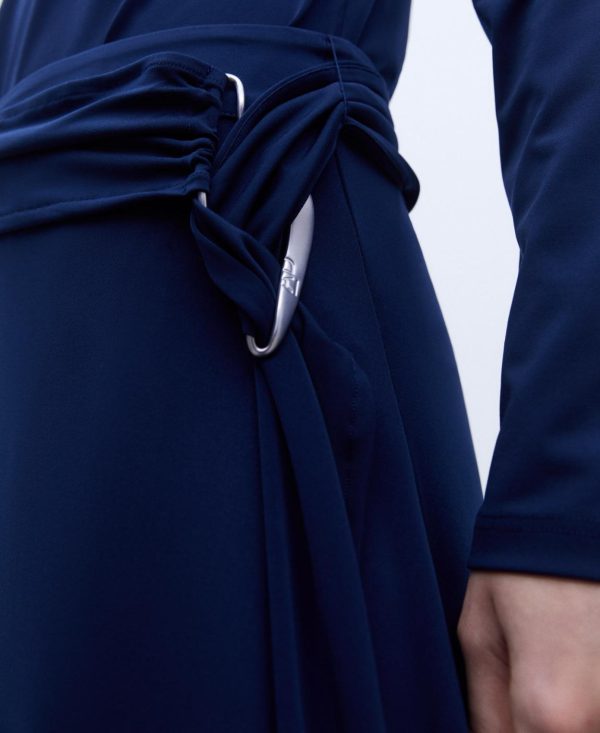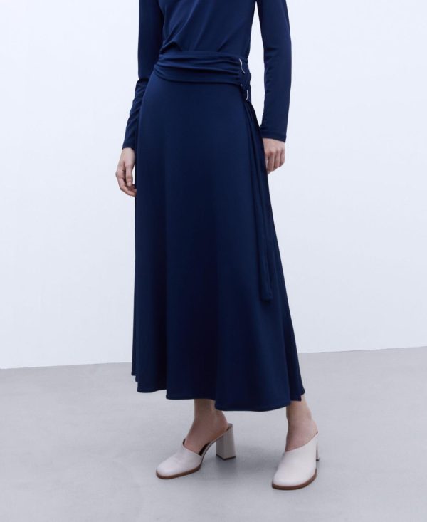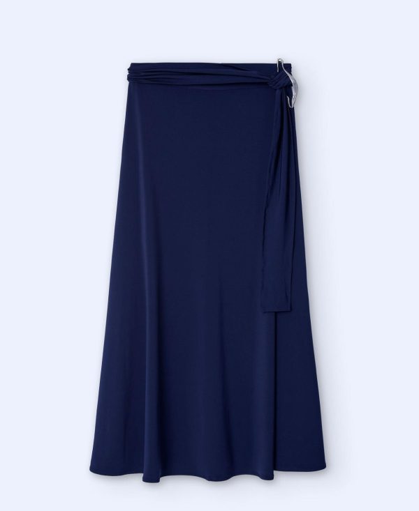 Falda de media capa. Cinturilla con trabillas. Cinturón drapeado y fijo. Hebilla metálica. Cierre posterior con cremallera invisible. Largo sobre tobillo. Logotipada.