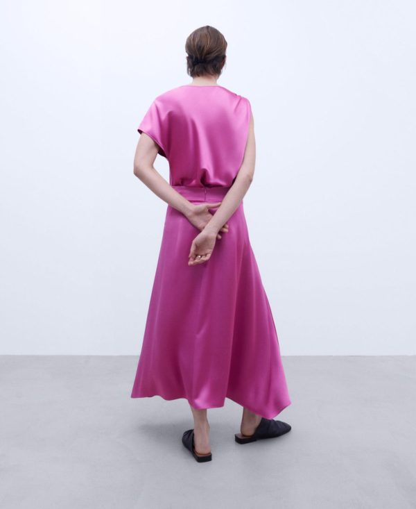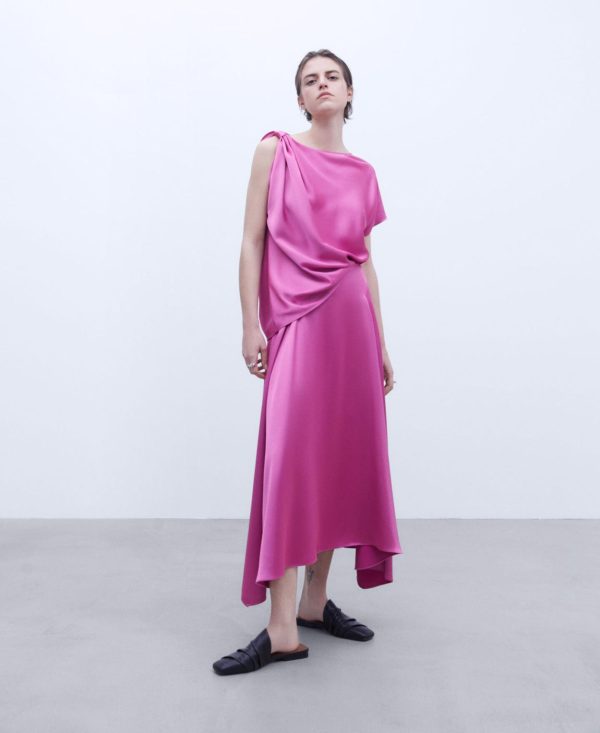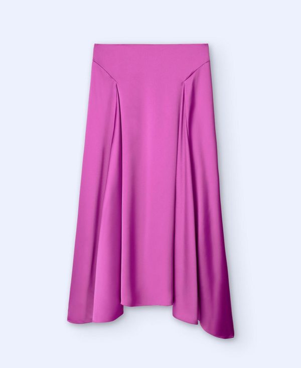 Falda midi. Godet. Cinturilla posterior. Cierre posterior con cremallera invisible. Pinza posterior. Bajo asimétrico.