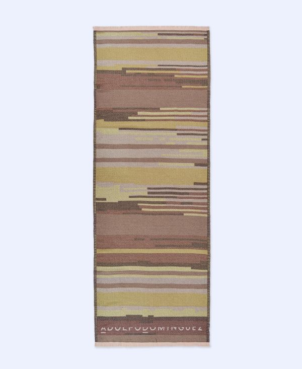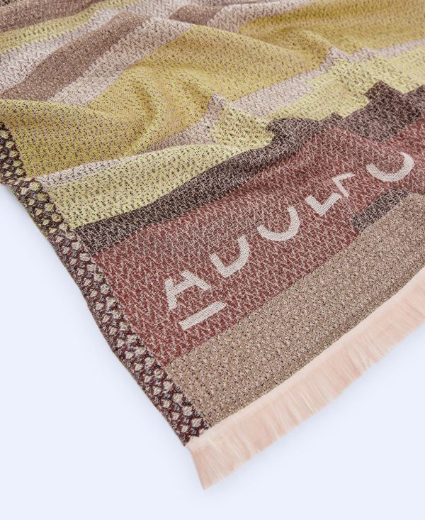 Estampado multirrayas en telar Jacquard. Fleco corto. Logotipo estampado.
