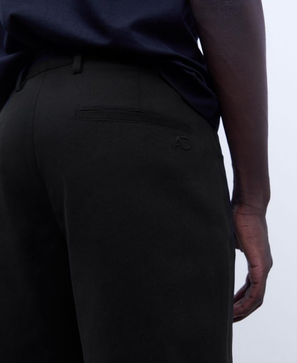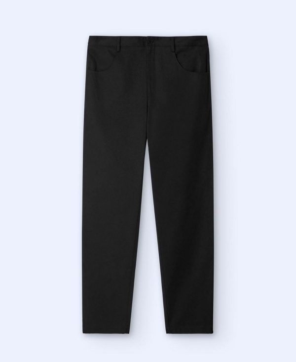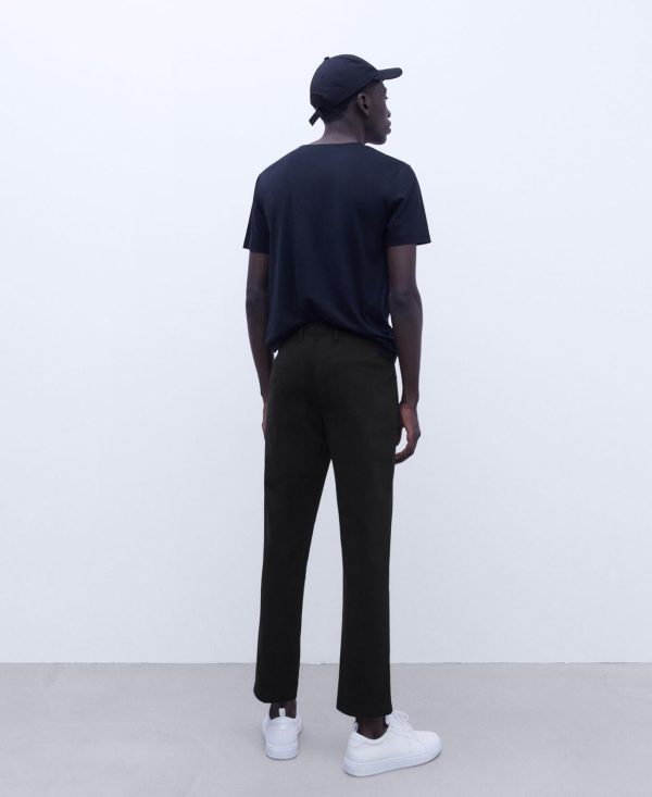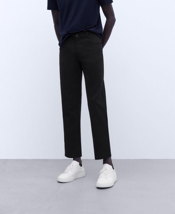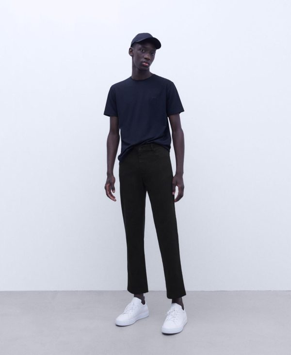 Bolsillos redondeados en el frontal y bolsillos traseros en vivo. Logotipo bordado en el bolsillo trasero. Cierre botón y cremallera. Slim fit.