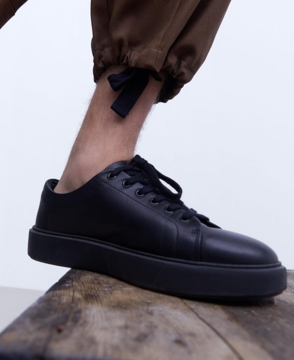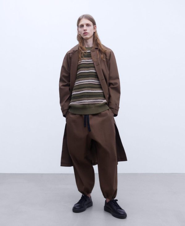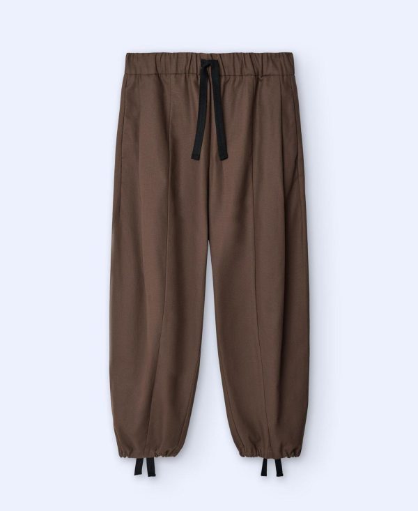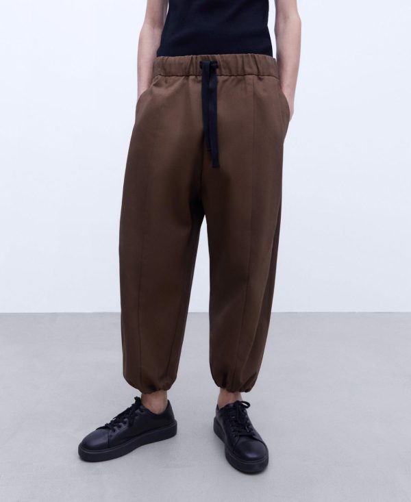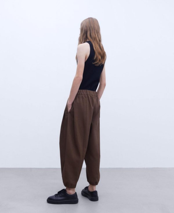 Pantalón oversize en algodón encerado. Cinturilla elástica con cordón. Costuras verticales. Bajos elásticos.