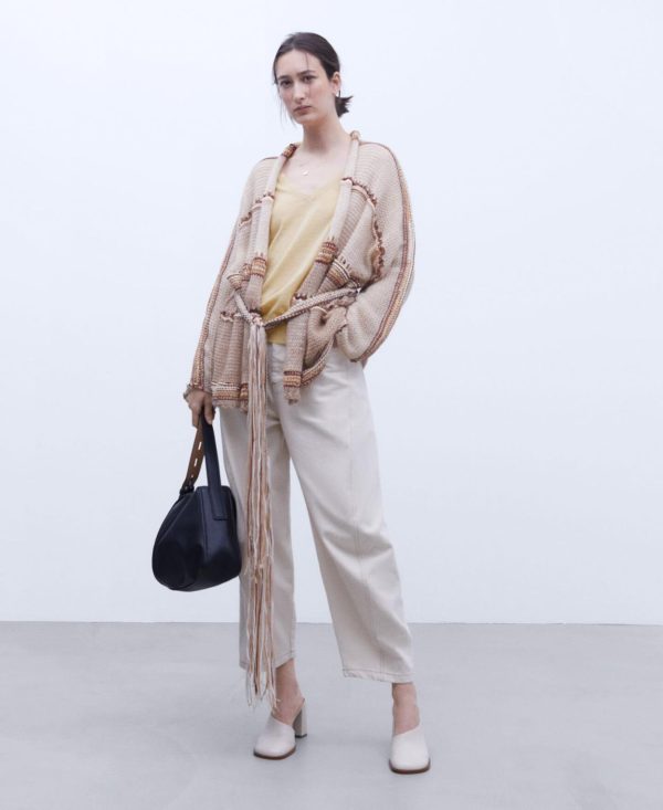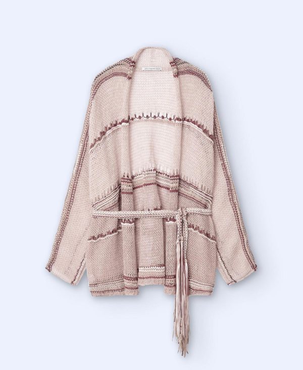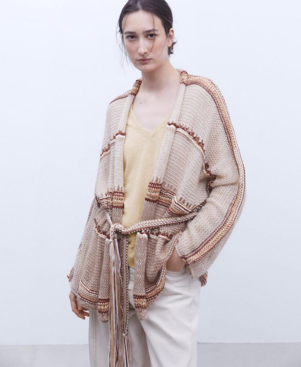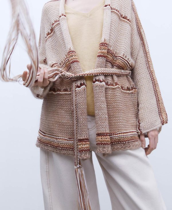 Chaqueta de punto. Cinturón. Manga larga. Cintas horizontales hechas a mano.
