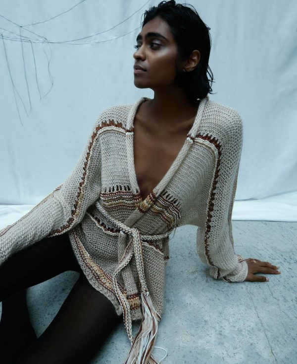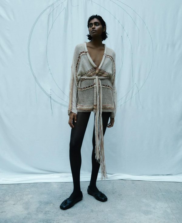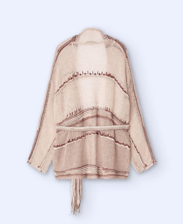 Chaqueta de punto. Cinturón. Manga larga. Cintas horizontales hechas a mano.