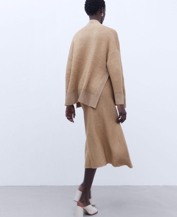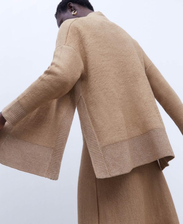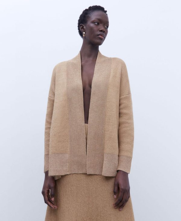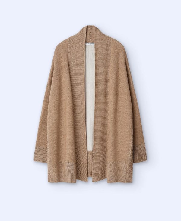 Chaqueta de punto doble frontura. Tejido de lino. Cuello kimono. Manga larga. Abertura lateral. Remates en canalé.