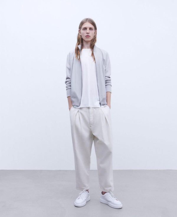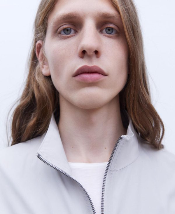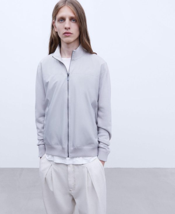 Harrington cuello Mao en algodón. Cierre cremallera. Bolsillos laterales en vivo. Remates en canalé.