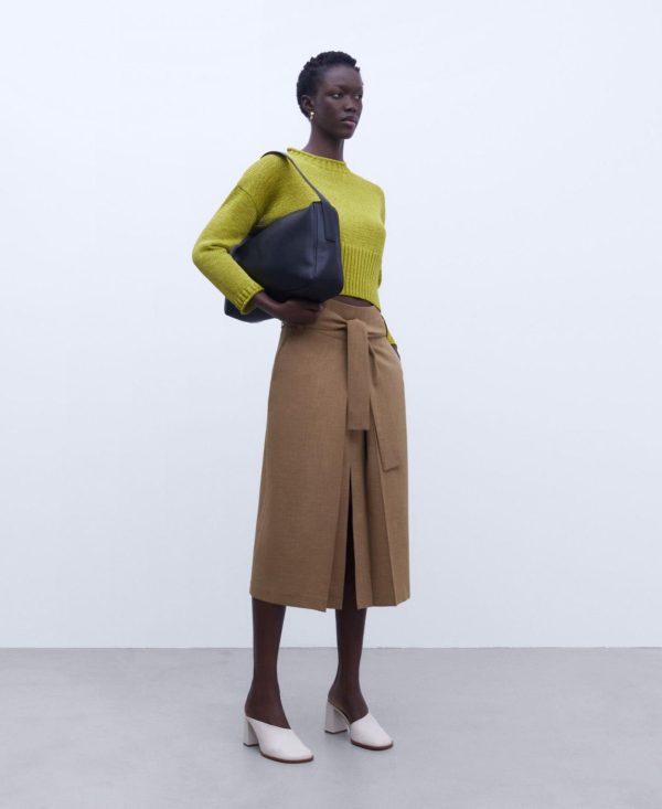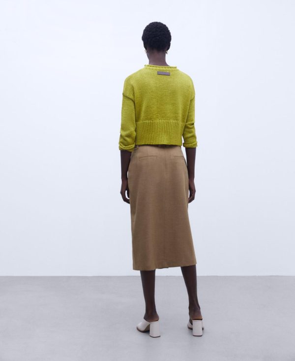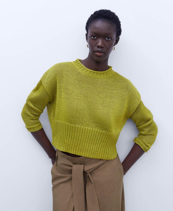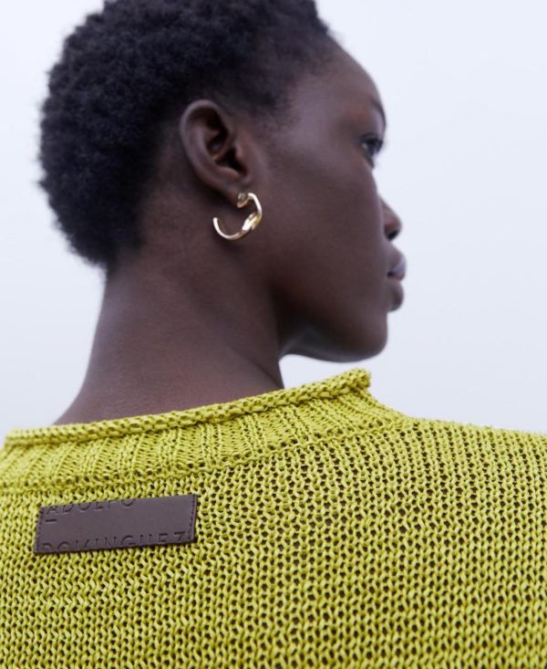 Cuello caja. Manga larga y caída. Remates en canalé ancho.