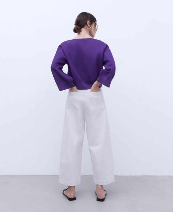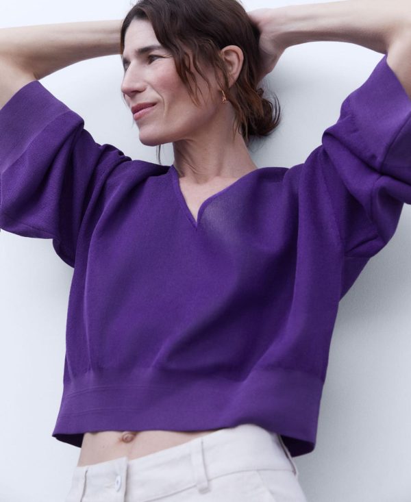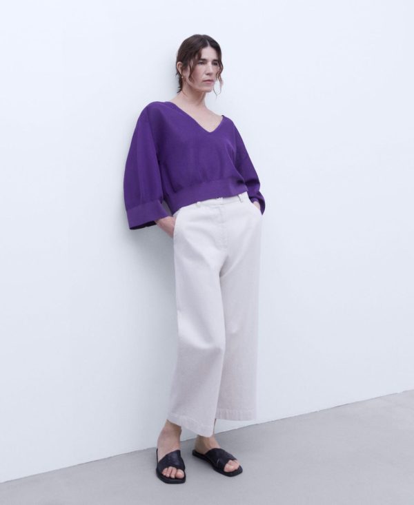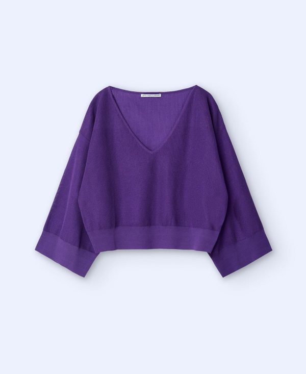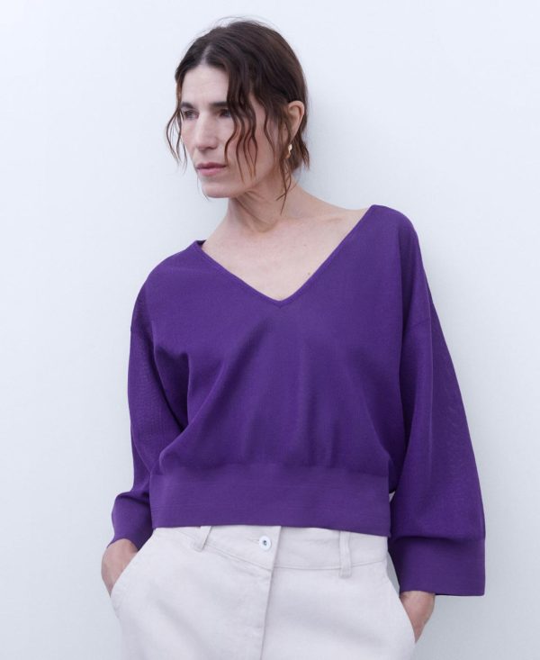 Cuello pico. Manga amplia. Remates en punto. Silueta redondeada.