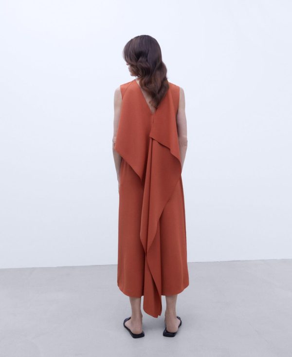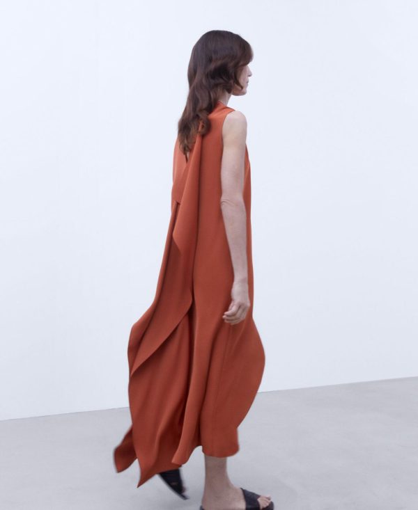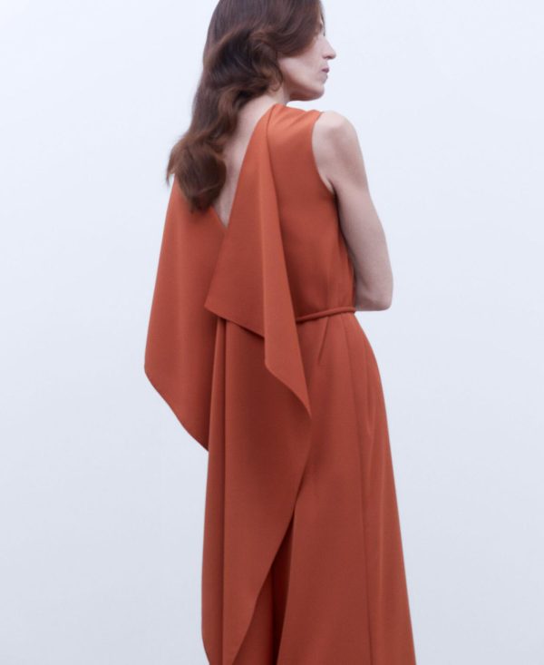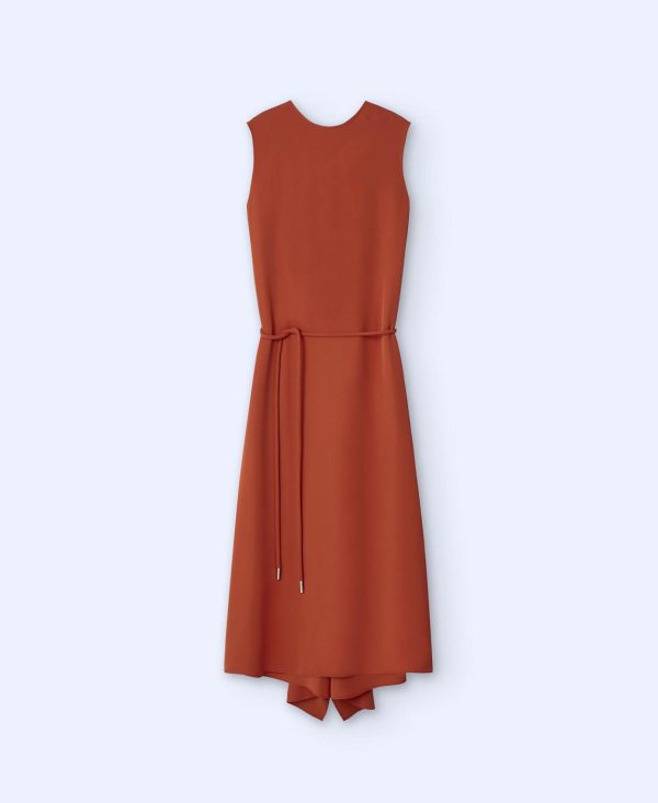 Cuello redondo. Manga sisa. Cinturón. Escote de espalda en pico. Espalda drapeada. Evasé.