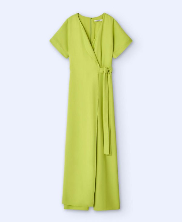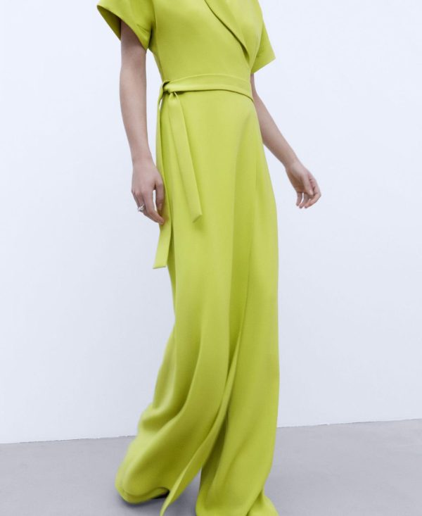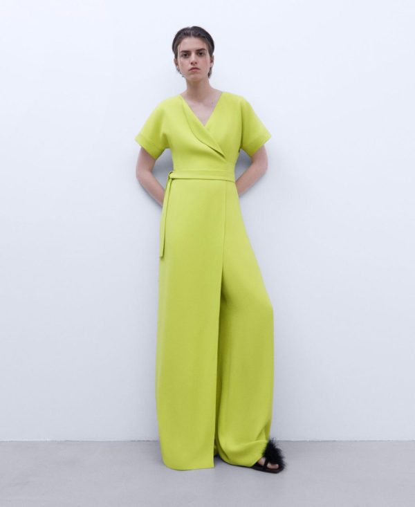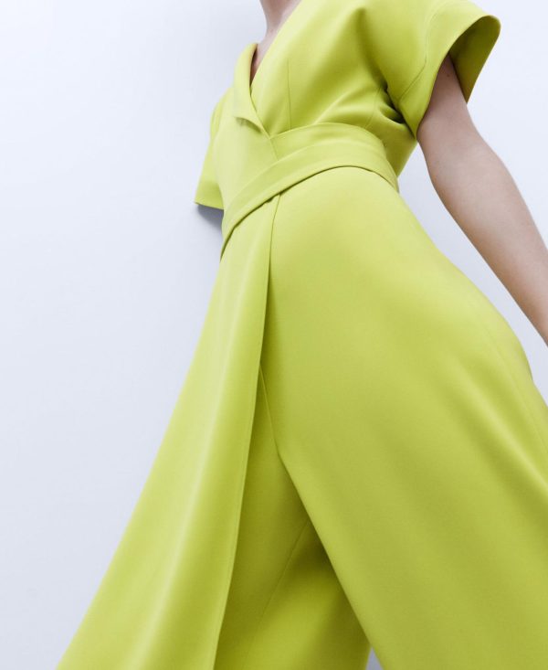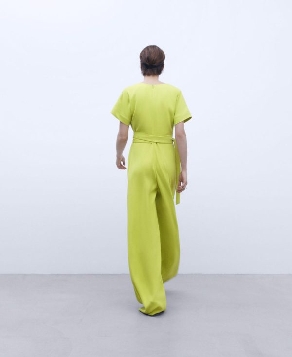 Mono monocolor. Escote cruzado en pico. Manga japonesa. Cinturón. Cierre posterior con cremallera invisible. Bajo rendondeado.