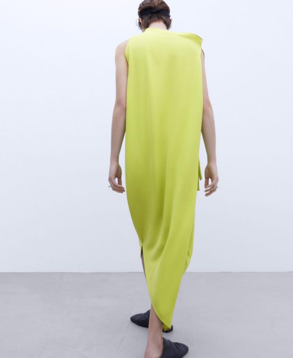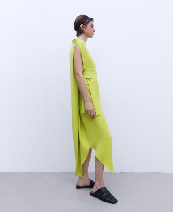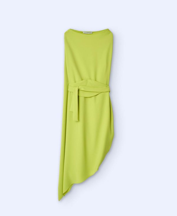 Vestido asimétrico monocolor. Escote barco. Sin mangas. Cierre lateral con cremallera invisible. Cinturón fajín. Bajo asimétrico.
