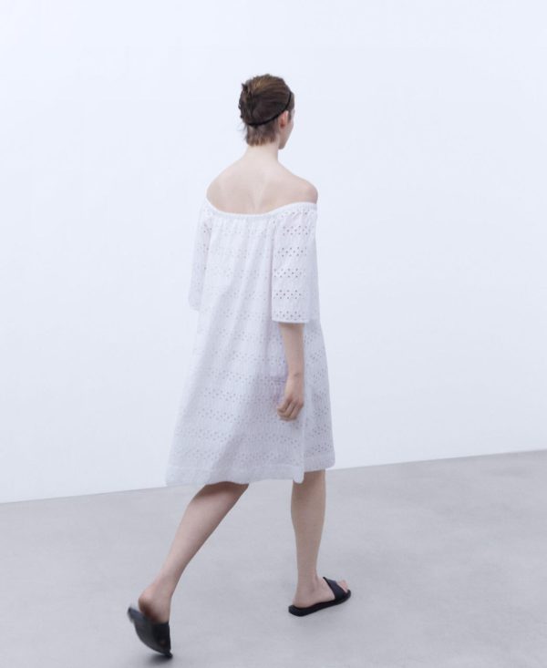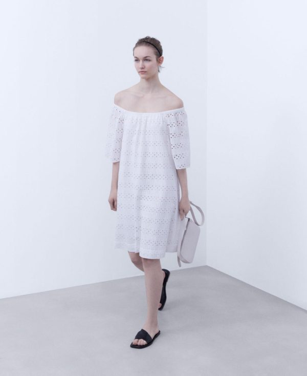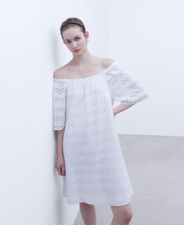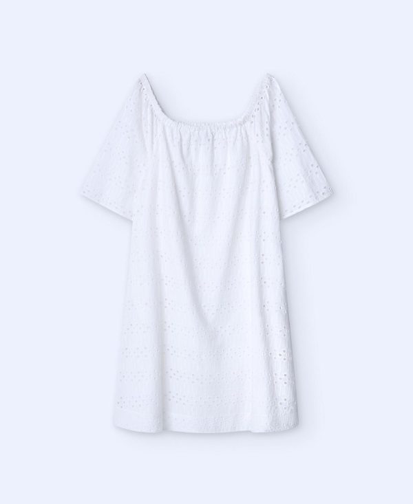 Bordado inglés. Escote barco fruncido. Manga corta acampanada. Forro en algodón. Bajo recto.