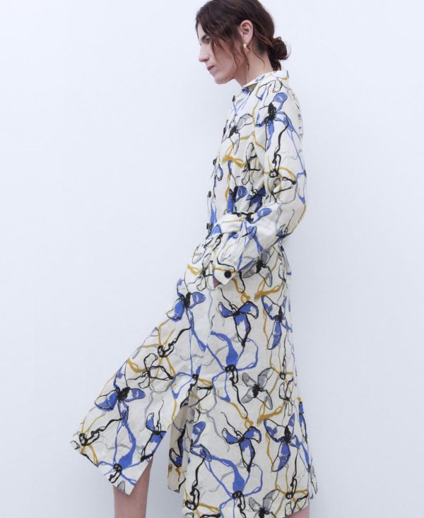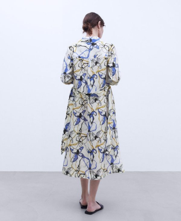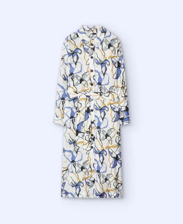 Cuello camisero. Botonadura central. Manga larga. Puño abotonado. Cinturón. Canesú posterior. Estampado. Corte recto.