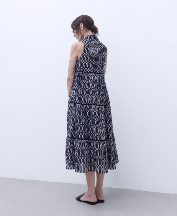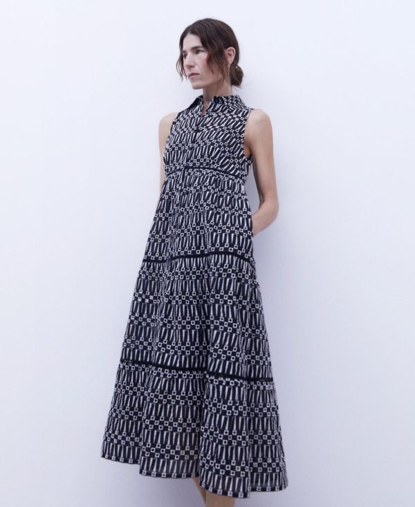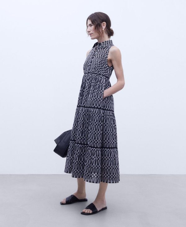 Cuello camisero. Botonadura central. Manga sisa. Bordado inglés.