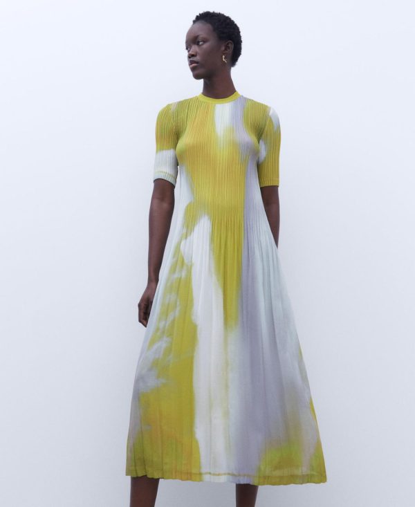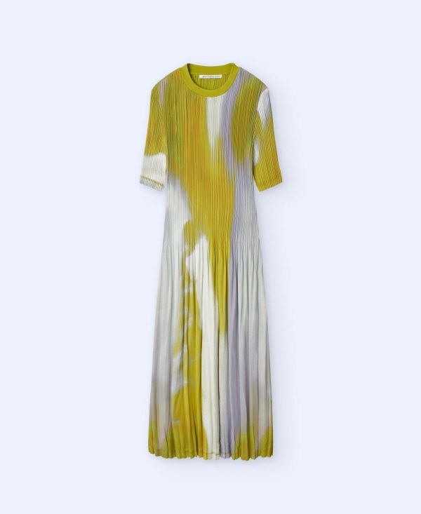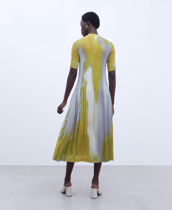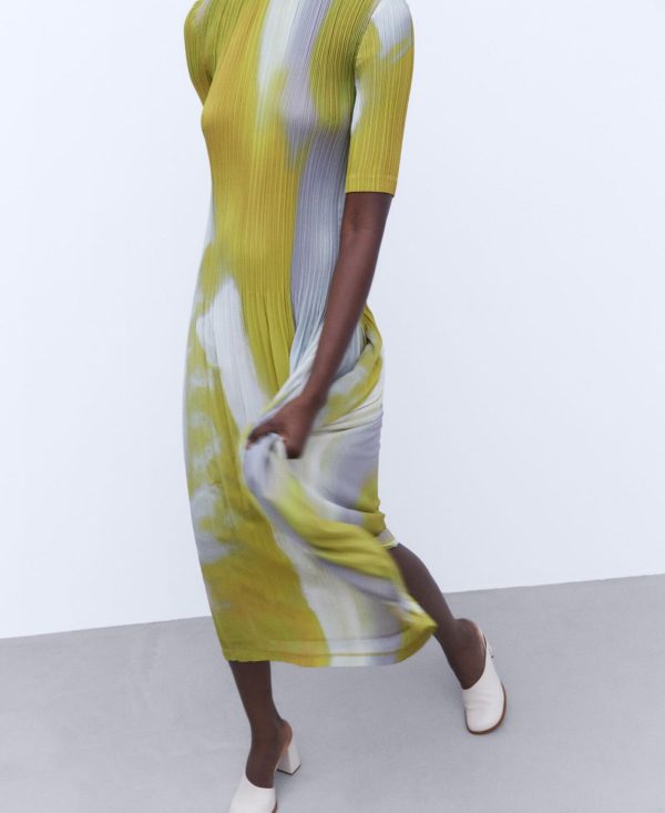 Vestido largo en crinkle. Cuello redondo. Estampado. Manga corta. Dos plisados.