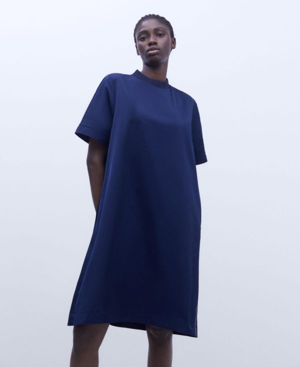 Vestido evasé con cuello caja. Cuello en canalé. Manga ranglan al codo. Cierre posterior con cremallera. Costuras adelantadas. Bolsillo lateral.