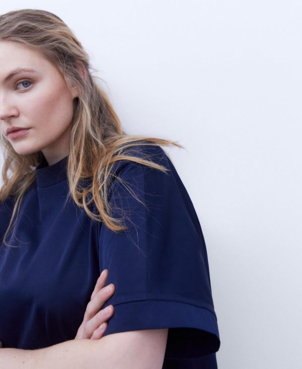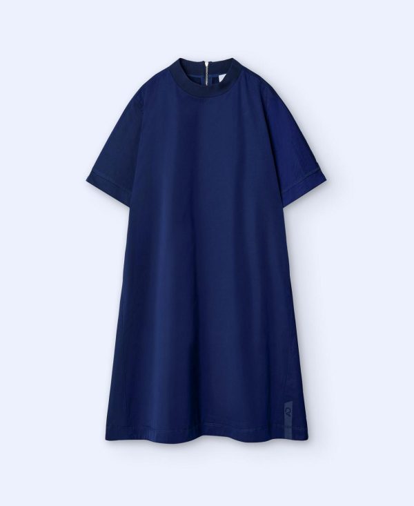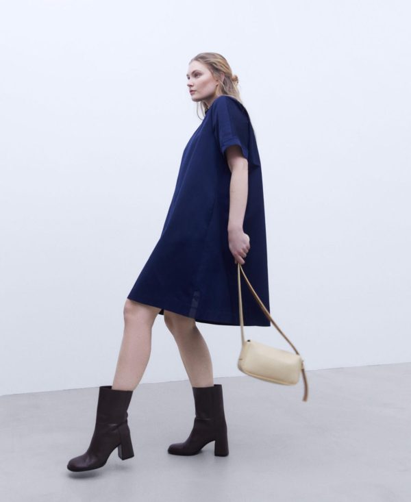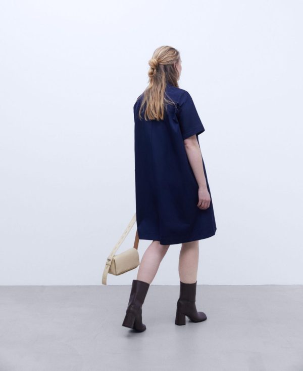Vestido evasé con cuello caja. Cuello en canalé. Manga ranglan al codo. Cierre posterior con cremallera. Costuras adelantadas. Bolsillo lateral.
