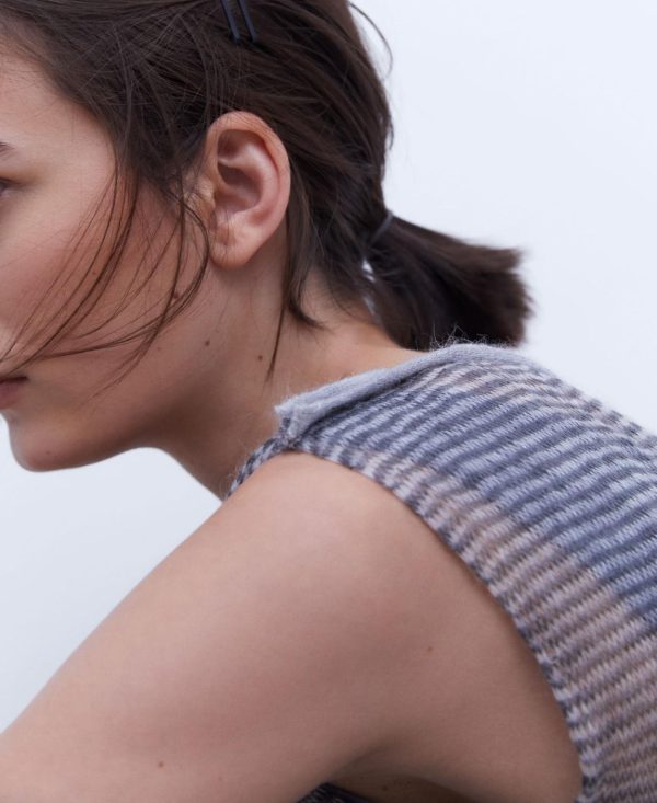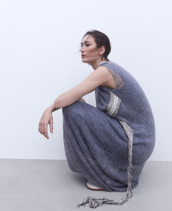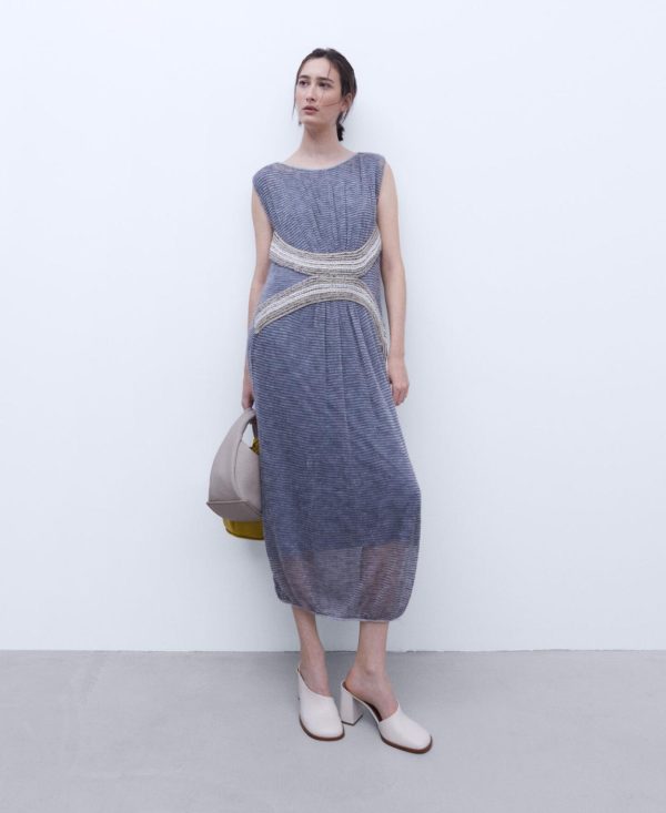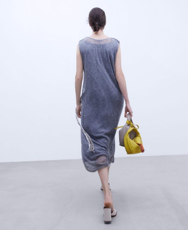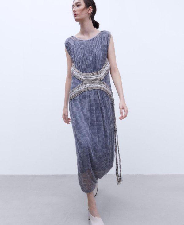 Vestido largo con aplicación jacquard. Cuello redondo. Sin mangas. Flecos de hilo en el lateral.