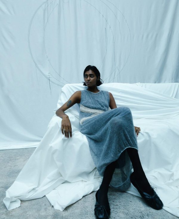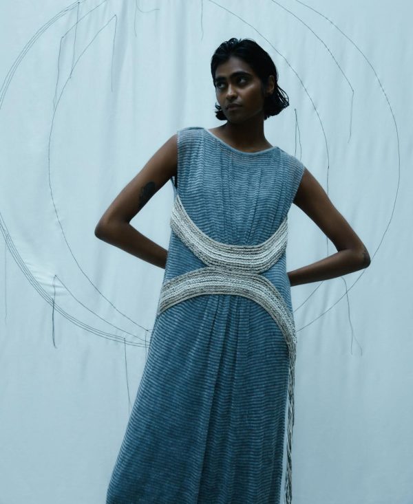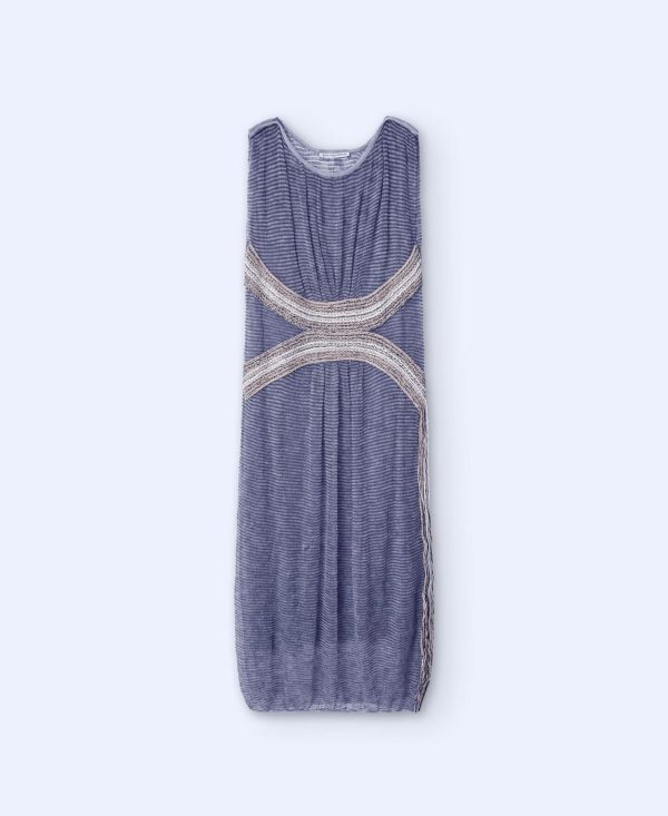 Vestido largo con aplicación jacquard. Cuello redondo. Sin mangas. Flecos de hilo en el lateral.