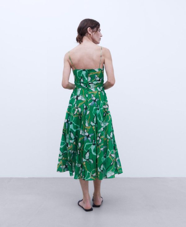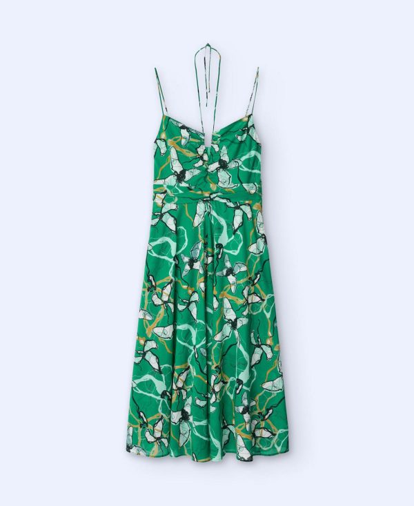 Tres tirantes. Escote fruncido. Falda capa. Espalda al aire. Cierre posterior con cremallera. Bajo recto.
