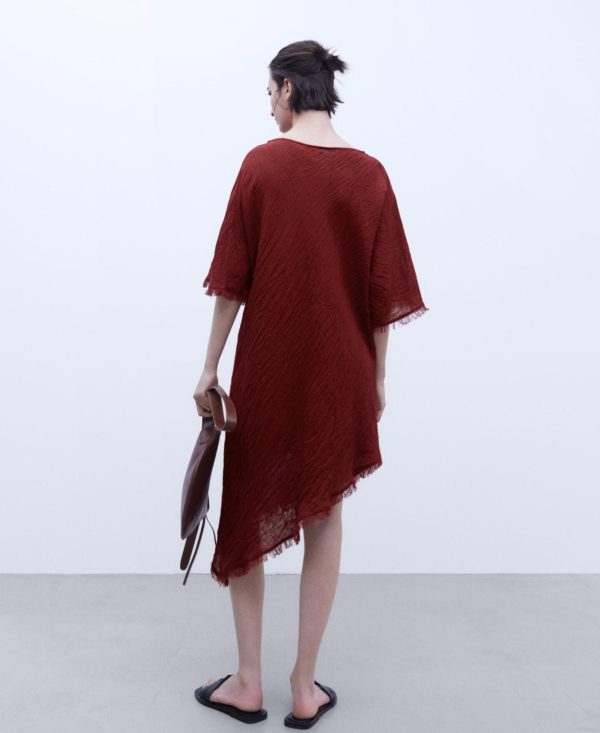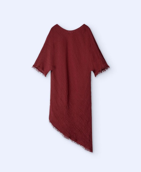 Escote redondo. Manga japonesa. Silueta recta. Bajo asimétrico. Remates con flecos cortos.