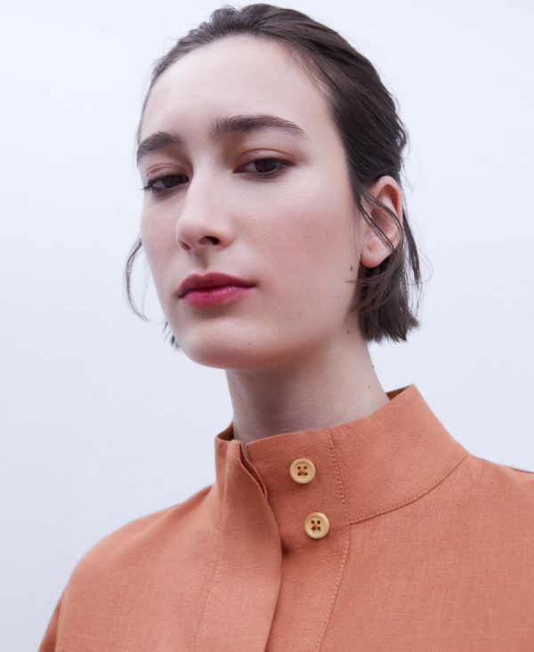 Cuello tira. Cierre con botones oculto. Tapeta. Manga tres cuartos. Canesú posterior.